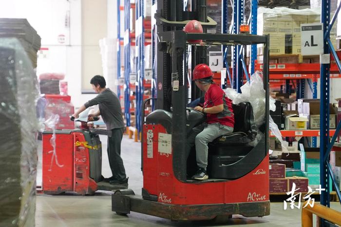 南沙保稅區倉庫里工作人員正在運送貨物。羅仲賢 攝