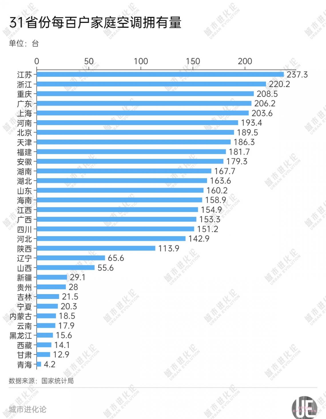 空調(diào)最多的不是四川重慶這些火爐,反而是江浙滬粵這些地方。江蘇每百戶有二百多臺,比南方還要多。可像陜西新疆這些曬得人掉皮的地方,空調(diào)反而沒那么普及。新疆朋友說他們早穿棉襖午穿紗,晚上涼快不怎么用得上。