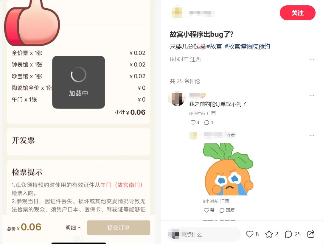 今日凌晨,部分網(wǎng)友反映“故宮小程序出bug”,2分錢就可以買一張門票: