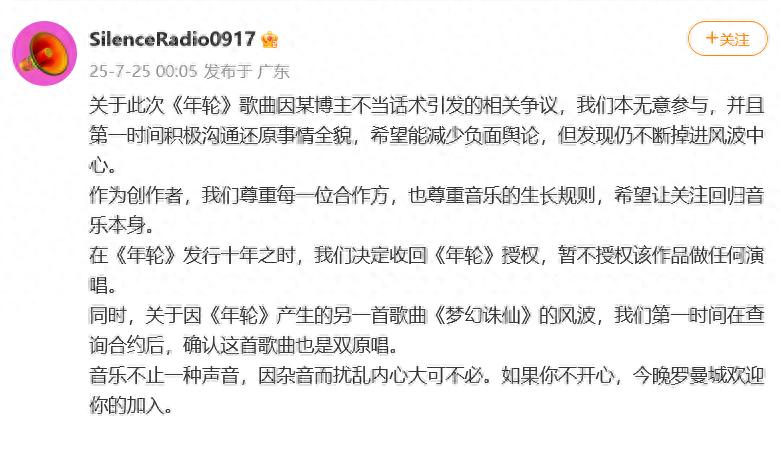 7月25日凌晨,汪蘇瀧對接號@SilenceRadio0917 發(fā)文宣布:決定收回《年輪》授權(quán)。