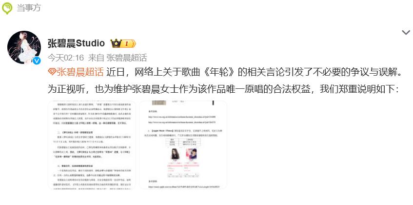 隨后,@張碧晨Studio 發(fā)文:“近日,網(wǎng)絡(luò)上關(guān)于歌曲《年輪》的相關(guān)言論引發(fā)了不必要的爭議與誤解。為正視聽,也為維護(hù)張碧晨女士作為該作品唯一原唱的合法權(quán)益我們鄭重說明。”