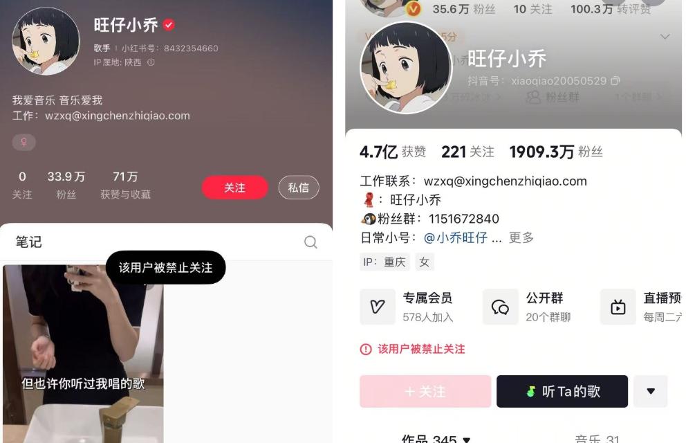 此外,九派新聞搜索發現,“旺仔小喬”的抖音賬號和小紅書賬號顯示,該用戶已被禁止關注。