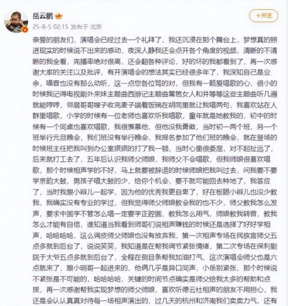我是真沒想到,演唱會結束都一星期了,這波爭議還沒消停。8月5日凌晨,岳云鵬突然在微博發了篇長文,字里行間透著一股子真誠,讓人看得出來他是真的憋了很久。