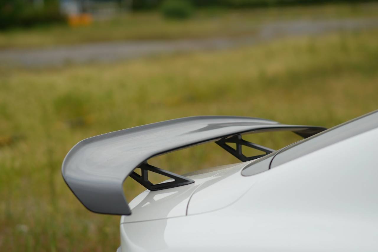 你看,當陽光投射到車尾,你的目光會無法避免被那巨大——注意我說的是“巨大”——的碳纖維尾翼所吸引。老實說,市面上根本沒有幾臺量產車出廠自帶這么大的碳纖維尾翼,這是頂級情緒價值。尾燈與標準版SU7無異,依然是貫穿式土星環造型。其實我覺得可以升級一下的,就像M4的OELD之于普通4系。畢竟Ultra的車主要是想,路上100%的車都只能看到它的尾燈,沒錯,就是100%。