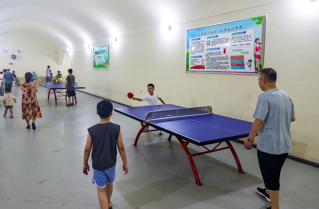 武漢市民在蛇山人防工程納涼點內(nèi)打乒乓球。(圖/視覺中國/中新社記者張暢)
