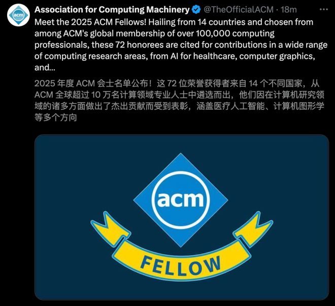 要知道,全球ACM的會員超過10萬人,能拿到Fellow的,占比僅約頂尖1%。